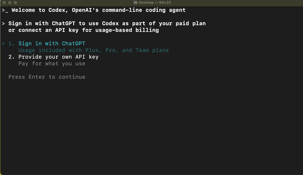 При первом запуске выберите "Sign in with ChatGPT". Это откроет браузер для авторизации через ваш OpenAI аккаунт. После успешной авторизации учетные данные сохраняются локально в ~/.codex/config.toml